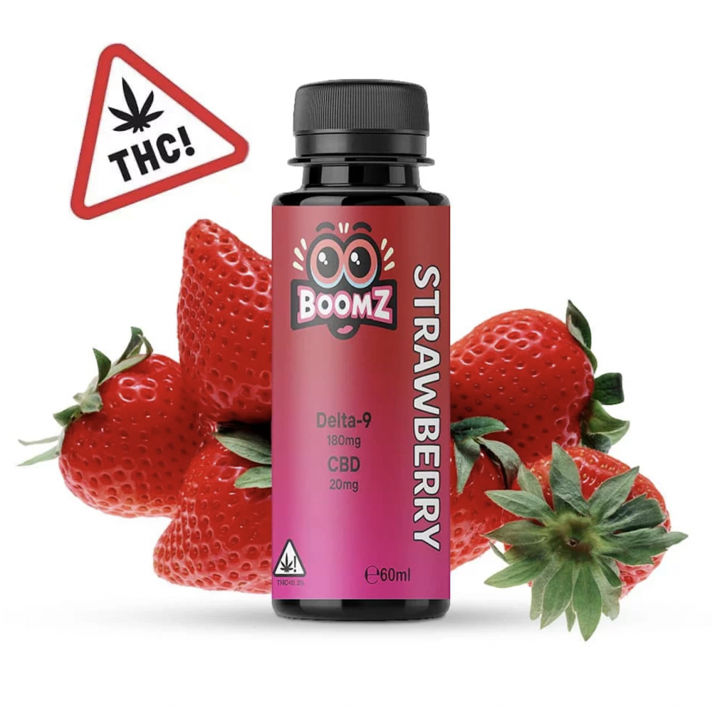 Boomz Strawberry D9 Syrup contains a total of 200 mg of D9 in a 60 ml bottle.